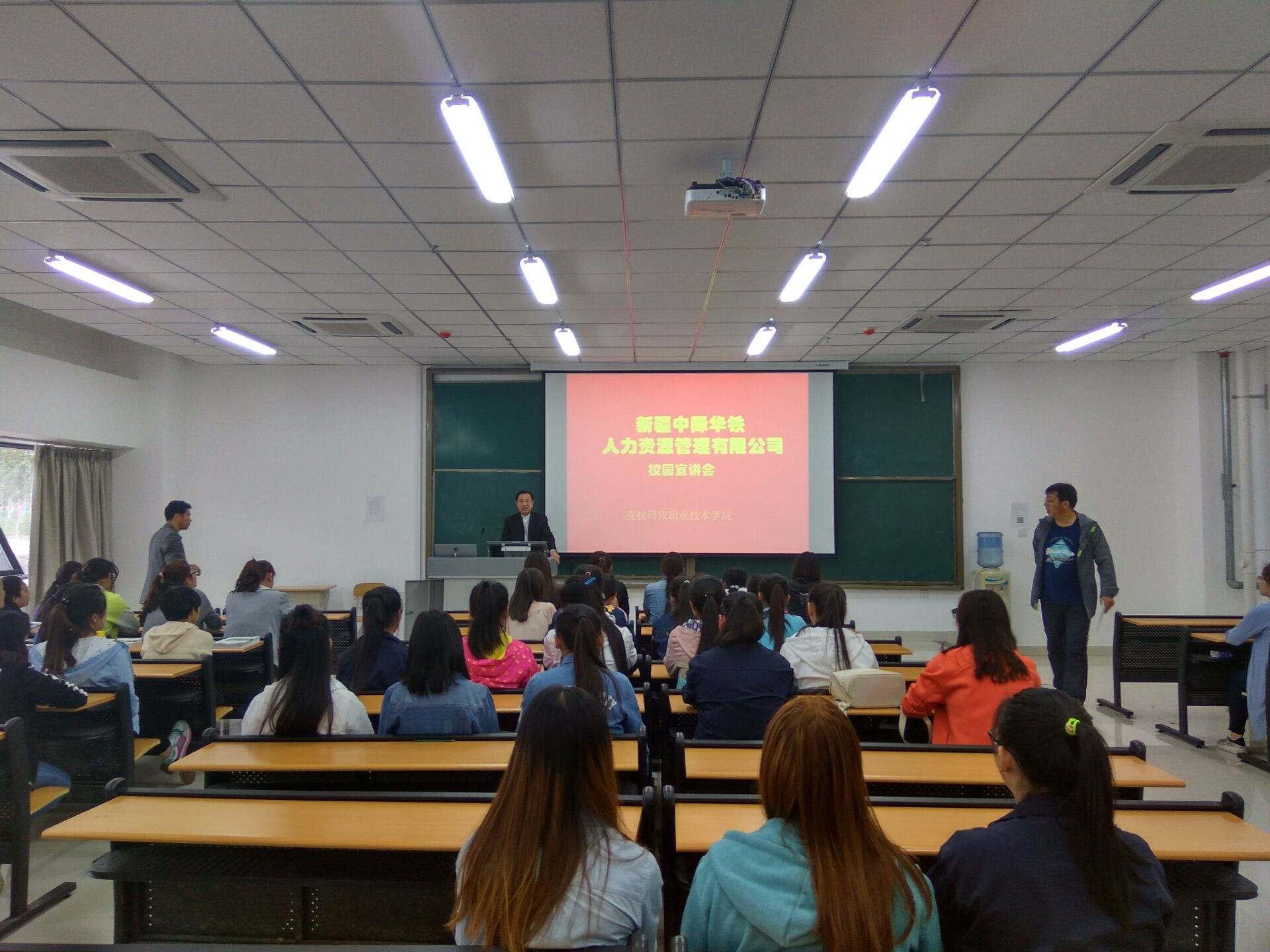 宣讲会开始前同学们对陈总经理此次代表公司前来就安检员方面等工作职位开展校园招聘宣讲表示热烈欢迎。新疆中际华铁人力资源管理有限公司陈总经理首先向同学们做自我介绍,说明来意之后便进入本次校园招聘宣讲会的主题。首先,陈总经理向大家简要介绍了新疆中际华铁人力资源管理有限公司的发展情况,以及与高铁发展方面的工作关系。接着便向大家介绍本次校园招聘的相关岗位,以及岗位上岗前培训取证的具体事宜。陈总经理对于培训地点、期间的饮食住宿条件等方面一一为同学细致介绍,还为同学们介绍了新疆未来高铁事业的发展问题。透彻的向同学们展示了本次招聘岗位的薪资待遇以及发展前景。