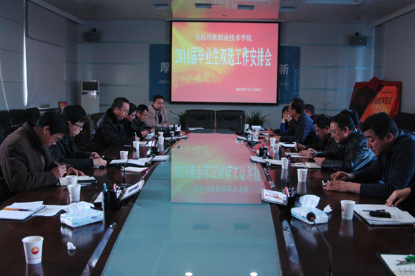 11月18日下午,2014届毕业生双选会工作安排会在唯实搂一楼会议室举行。学院党委书记彭建春、院长王和、副书记扎克.司马义、副院长周刚、付梅莉、宋磊,及党政办、学生处,教务处、总务处、招生就业指导处及各专业系部主任参加了本次会议,会议由学院副院长周刚主持。