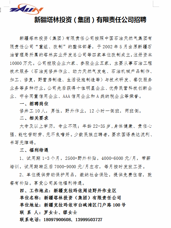 新疆塔林投资集团有限责任公司招聘简章